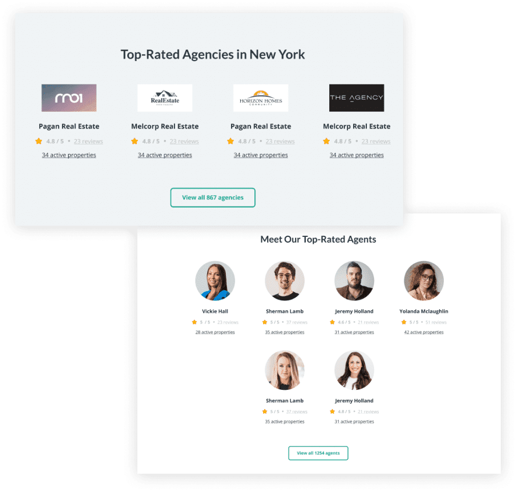 Display real estate professionals using attractive layouts. The best solution to perform agents/agencies, their listings, and ratings to clients.