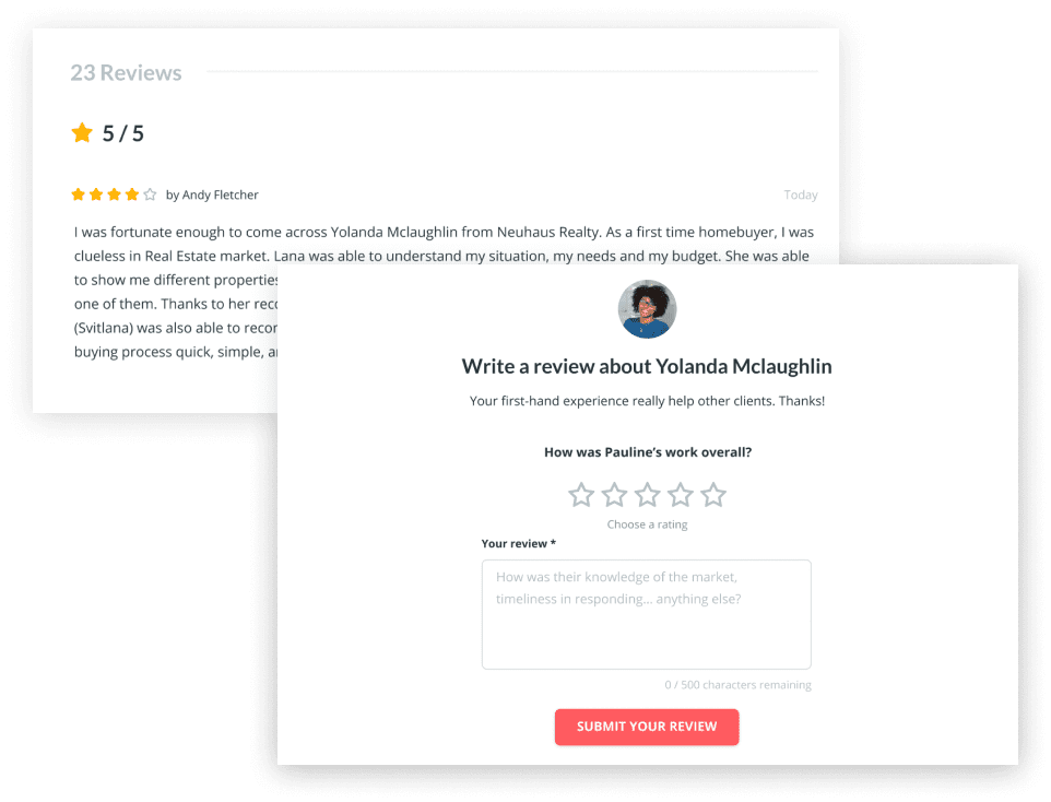 Provide significant trust to agent/agency by reviews. Reviews page and form to leave for a client's feedback.