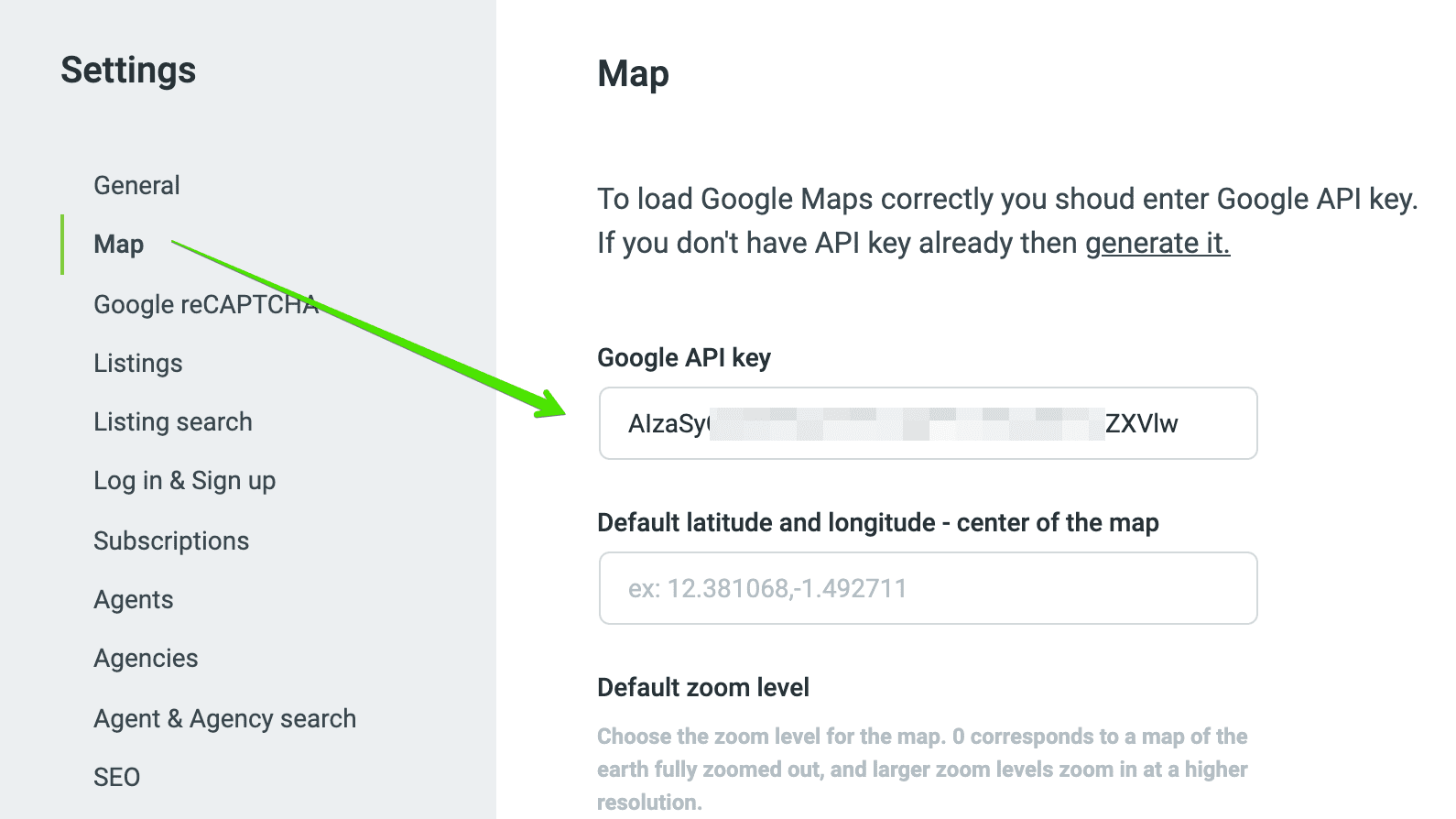 So you need to navigate back to Settings - > Map and enter your Google Maps API key there: