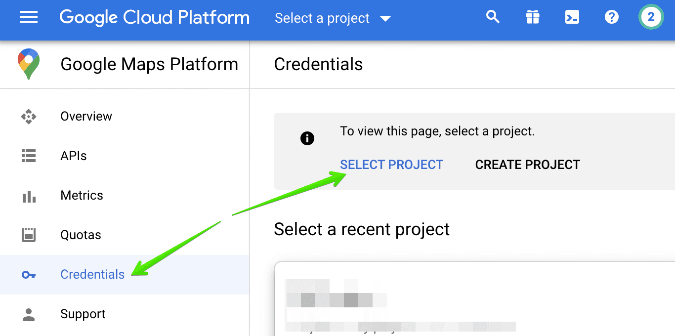 Step 1. Navigate to Google Maps Platform >> Credentials page. You will see there all your projects or create a new project there.