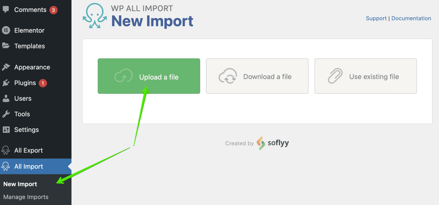 3. Go to WP ALL Import - > Import and Upload your CSV file: