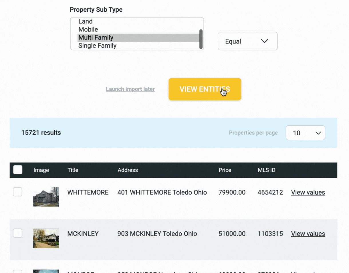 To import manually you need to click on Import and Select Manual. Then add filters if there are any required and press View Entities. You will get all MLS listings which are available according to your filters. Select and Import: