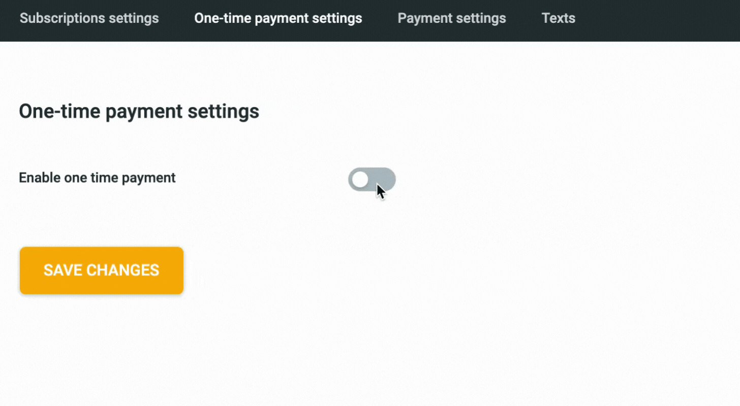 To enable one-time payment, please navigate to Subscriptions - > One-time payment settings: