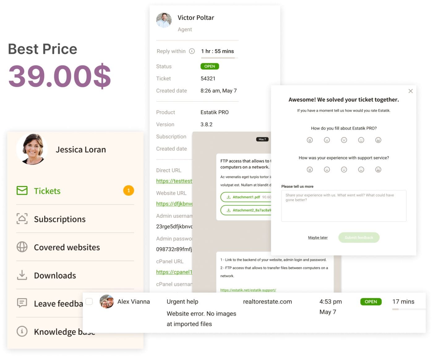 Gives you access to Support Area, where our technical support agents will assist you with configuring and setting up the Estatik Simple plugin on your website. If you don’t want to upgrade to the Pro version, you can still get dedicated support for your Simple version here — and you can cancel anytime!